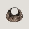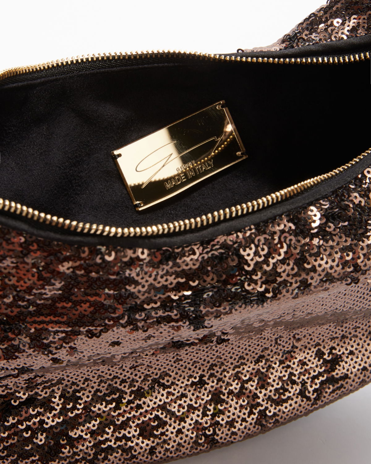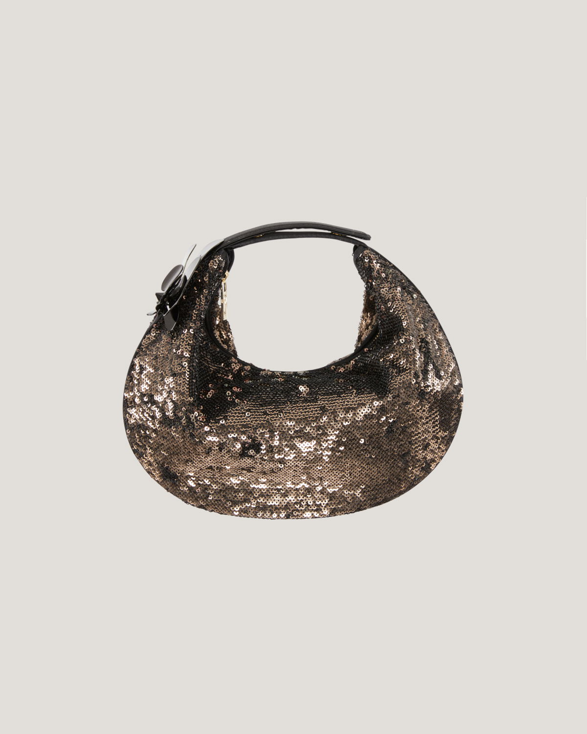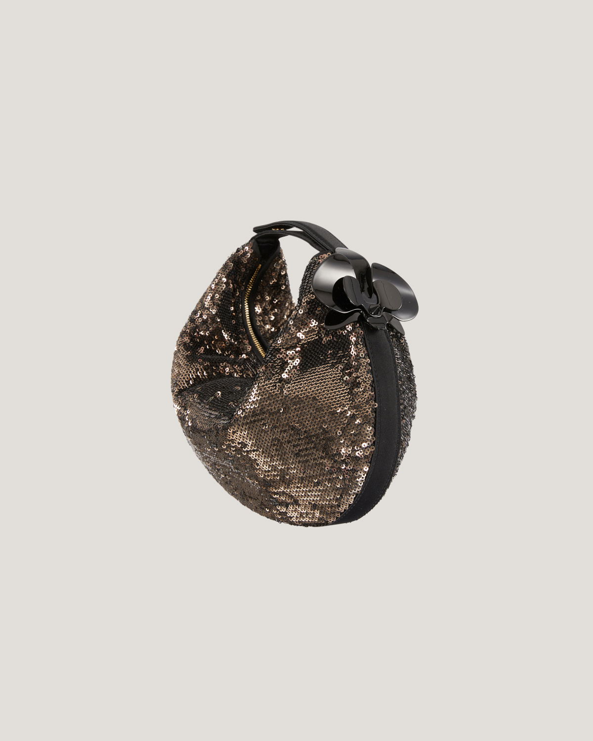 Creative Director Sara Cavazza reimagines the Fortune bag with a semi-spherical silhouette, made unique by soft folds that enhance its sculptural volume. In this version, a cascade of reflective sequins adds brightness and character, turning the accessory into a luminous focal point. The metallic orchid brooch, an iconic detail of the maison, brings a touch of femininity and elegance. Perfect for special events or elegant evenings, it pairs effortlessly with tailored suits or flowing silk dresses, completing any look with ease.