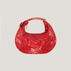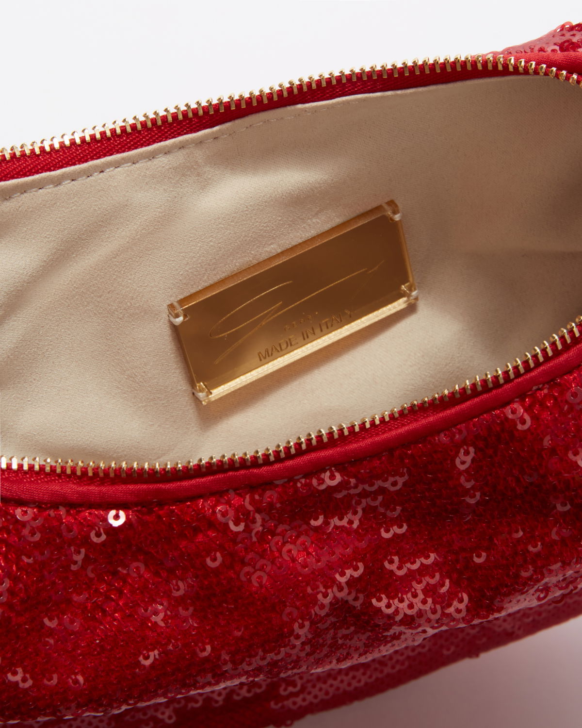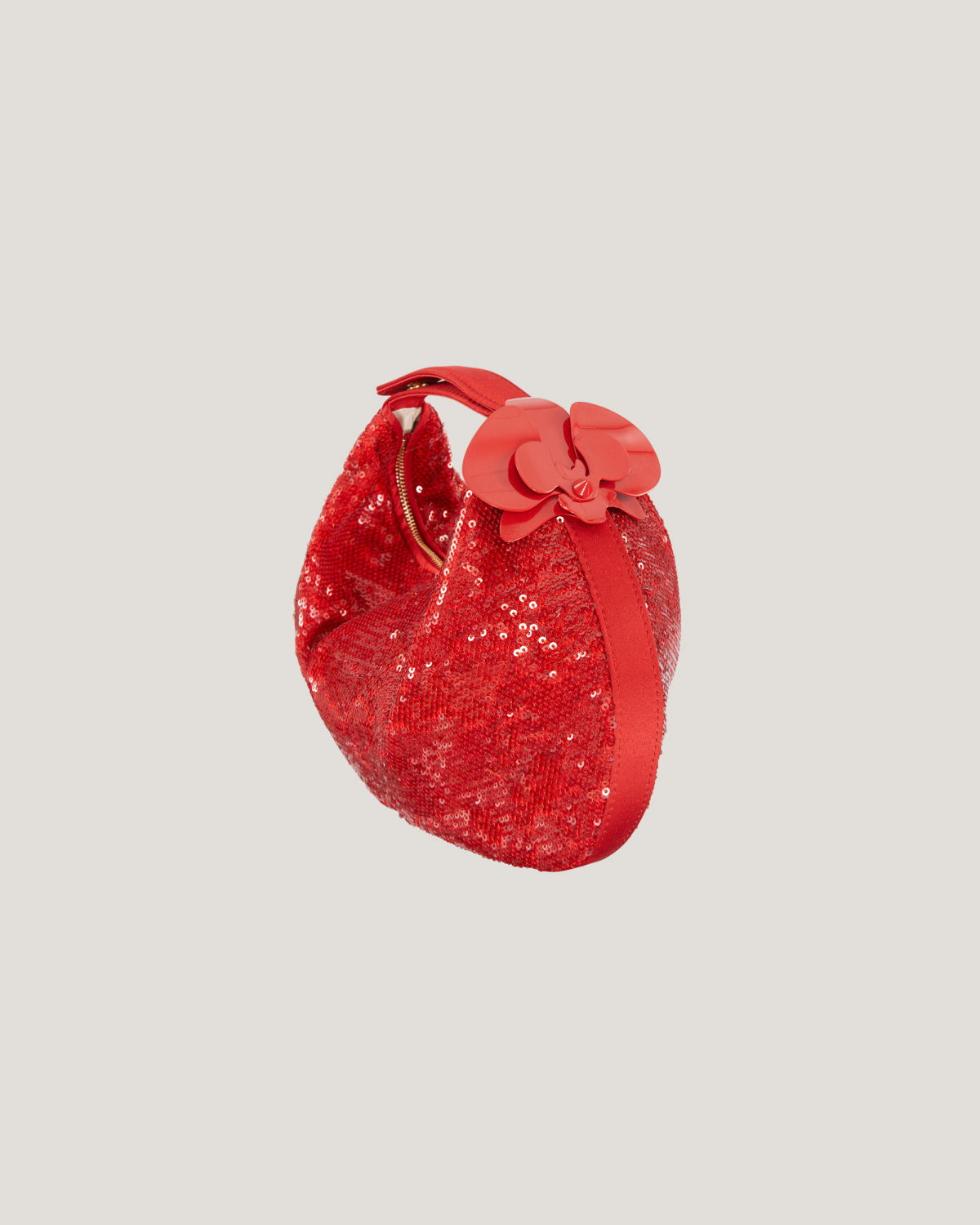 Creative Director Sara Cavazza reimagines the Fortune bag with a semi-spherical silhouette, made unique by soft folds that enhance its sculptural volume. In this version, a cascade of reflective sequins adds brightness and character, turning the accessory into a luminous focal point. The metallic orchid brooch, an iconic detail of the maison, brings a touch of femininity and elegance. Perfect for special events or elegant evenings, it pairs effortlessly with tailored suits or flowing silk dresses, completing any look with ease.
