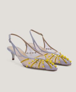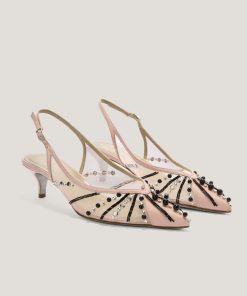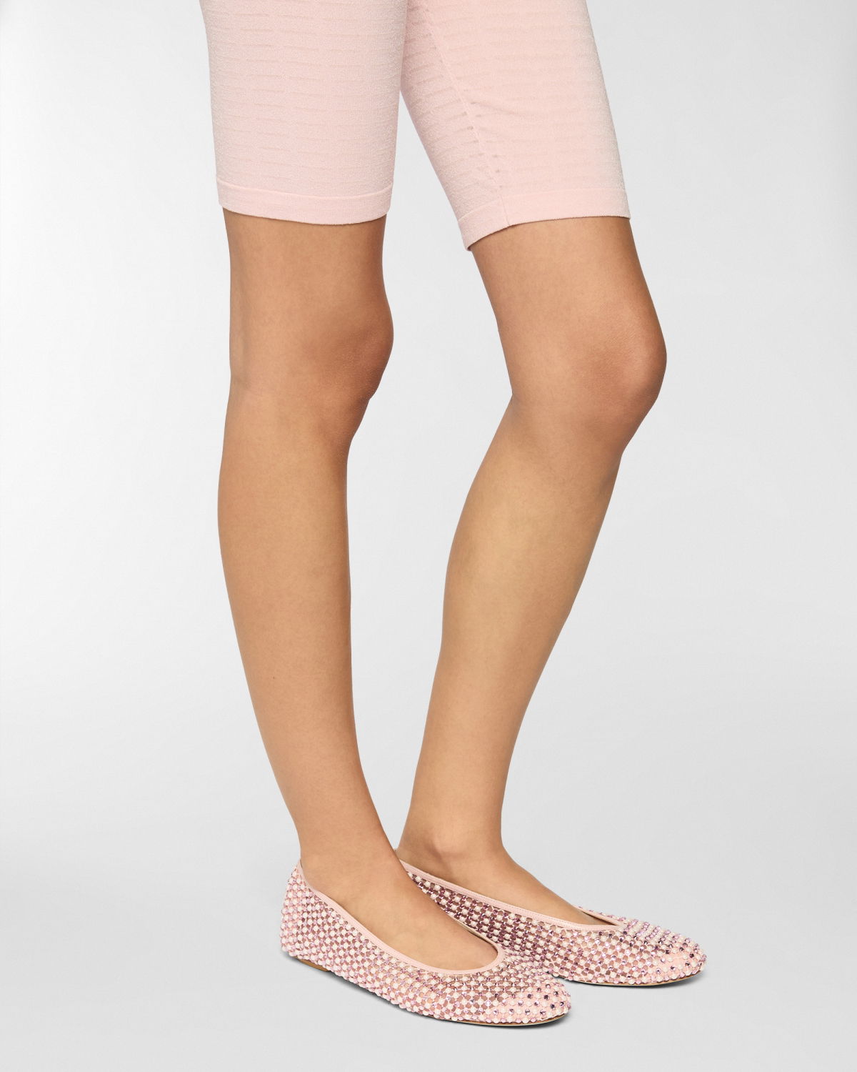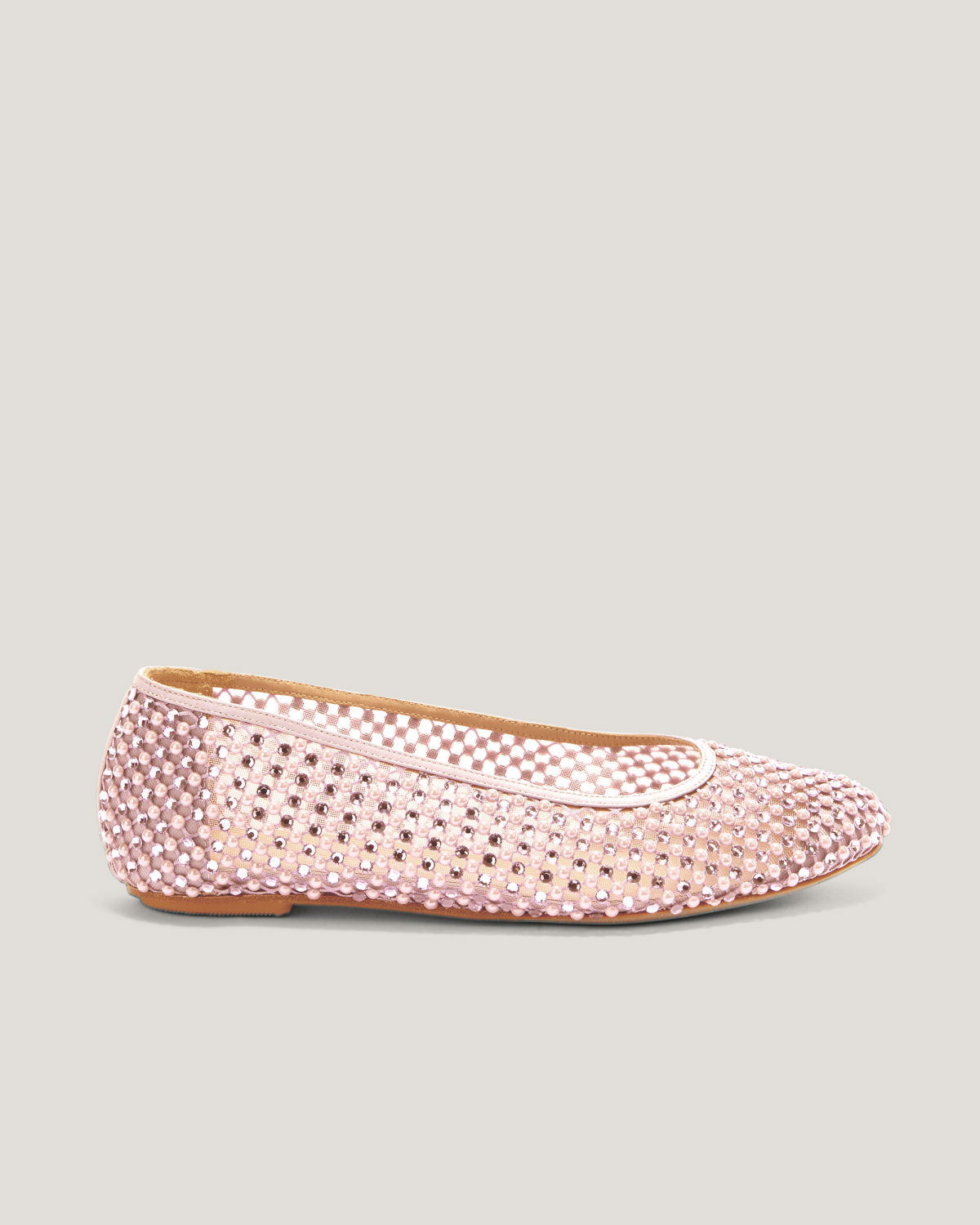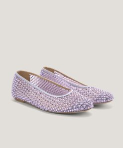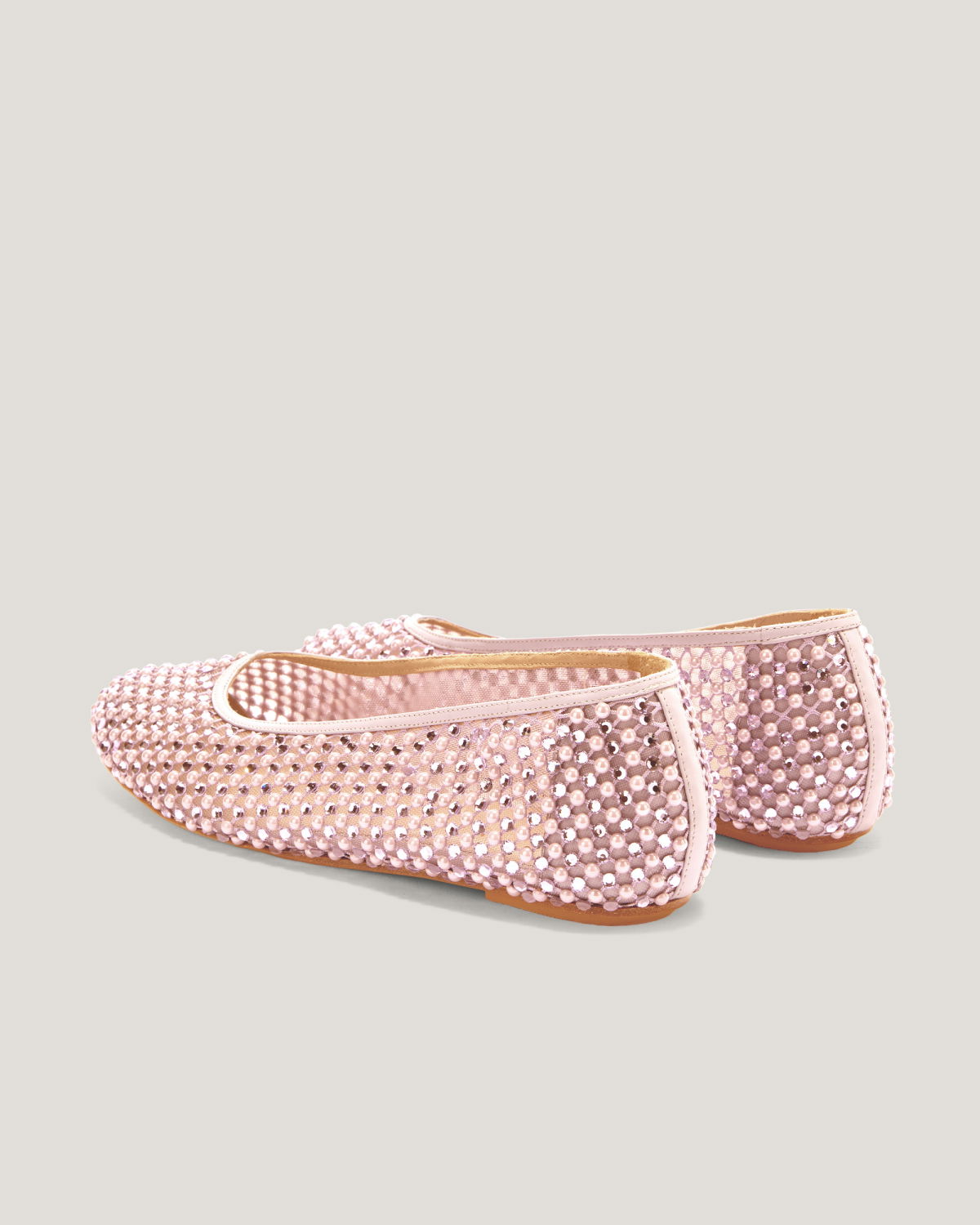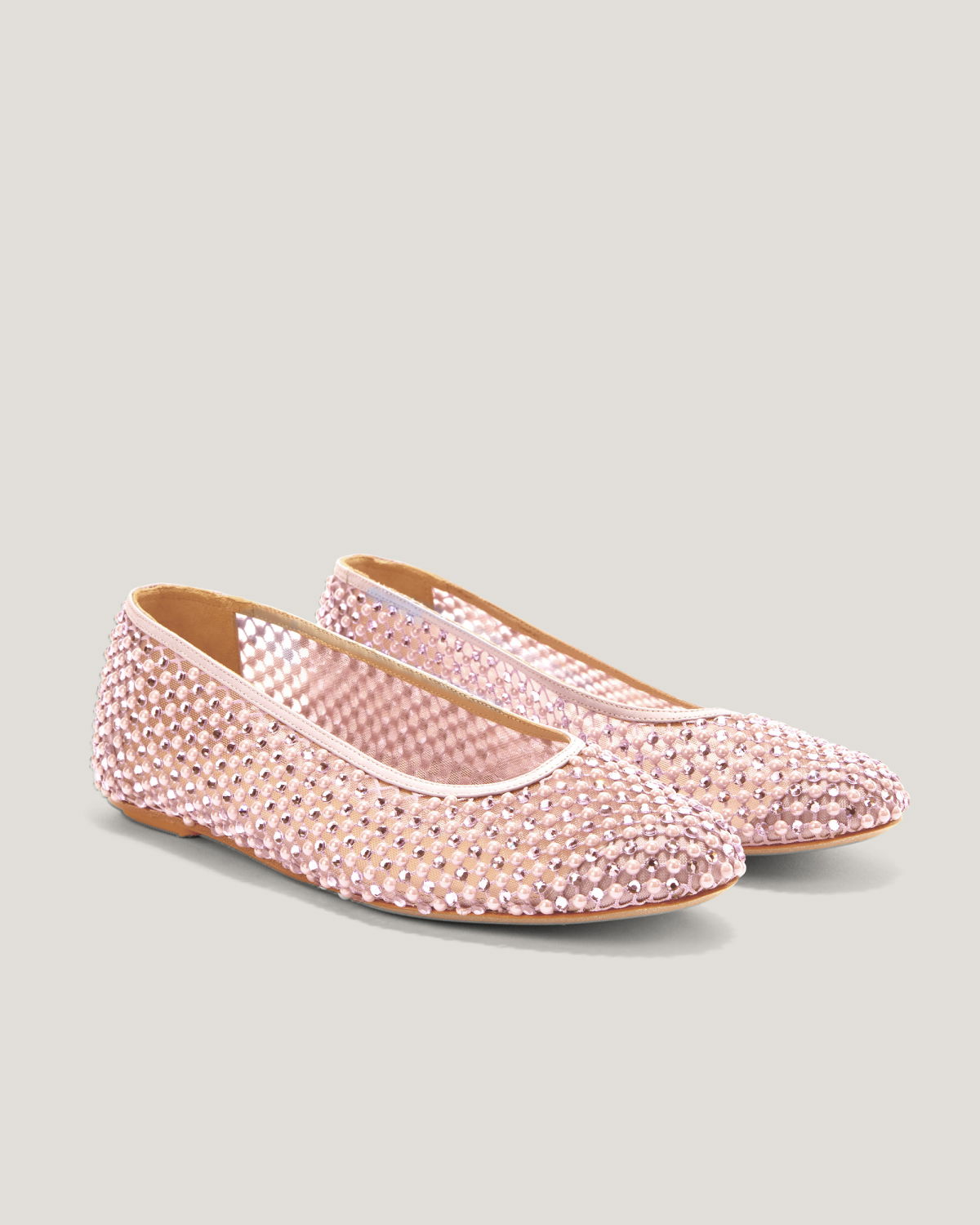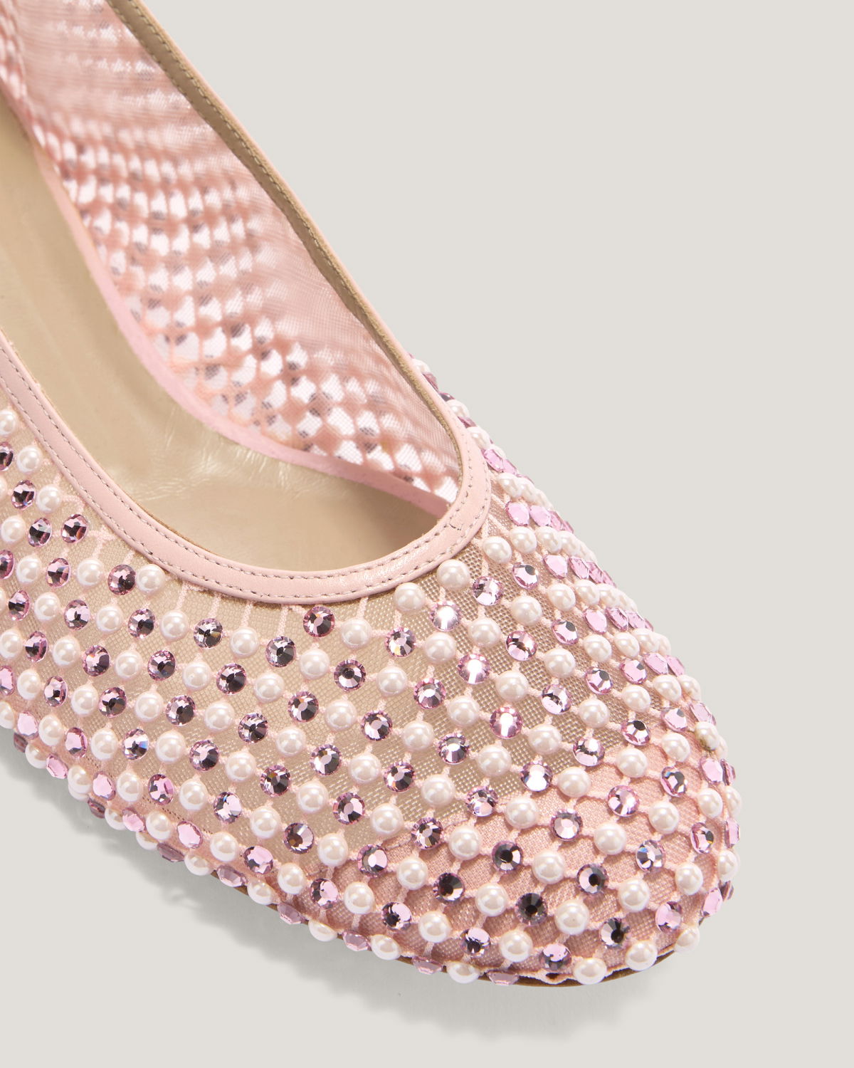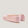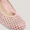 These ballet flats are crafted from transparent mesh, embellished with delicate microbeads and tonal rhinestones that add a sophisticated and elegant sparkle. The combination of lightweight materials and exquisite details makes these shoes perfect for adding a touch of glamour to any occasion while ensuring maximum comfort. The transparent upper is embellished with meticulously applied rhinestones, while the leather insole ensures all-day comfort. The pink tone adds a romantic and contemporary flair, making these flats the perfect accessory for any outfit.
