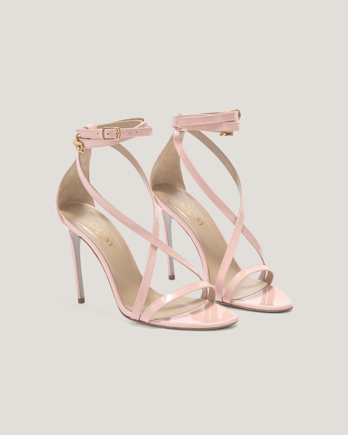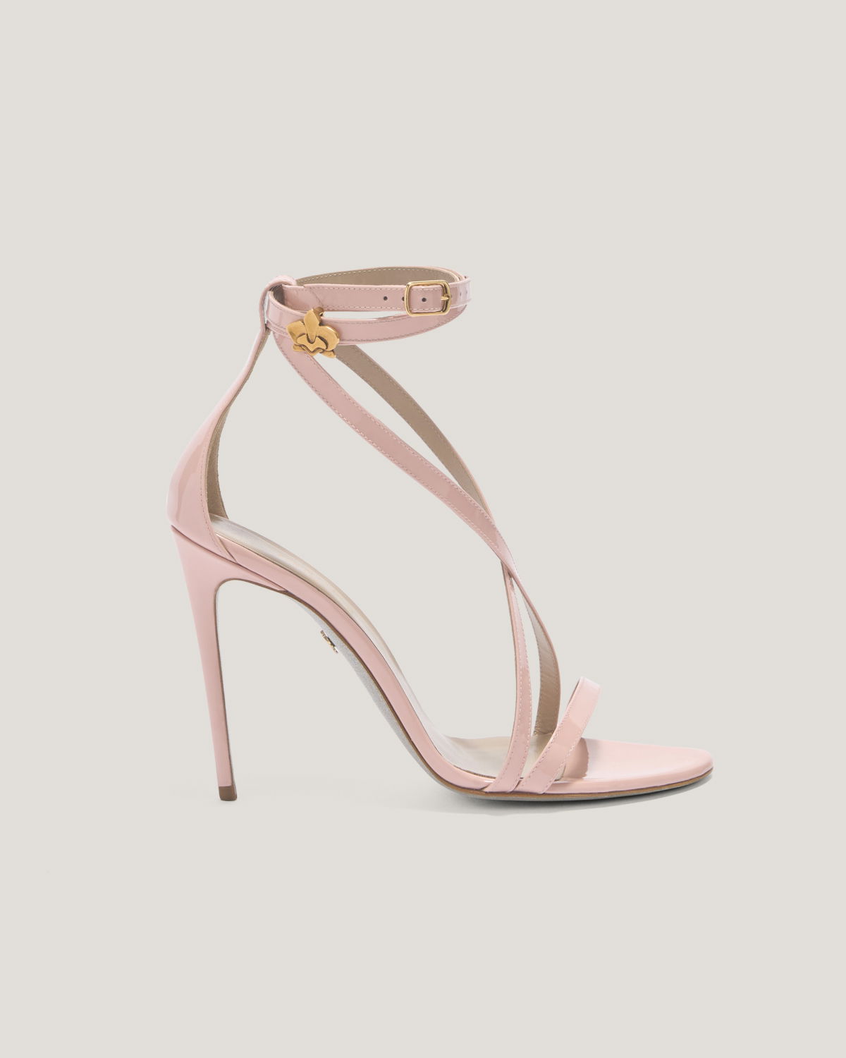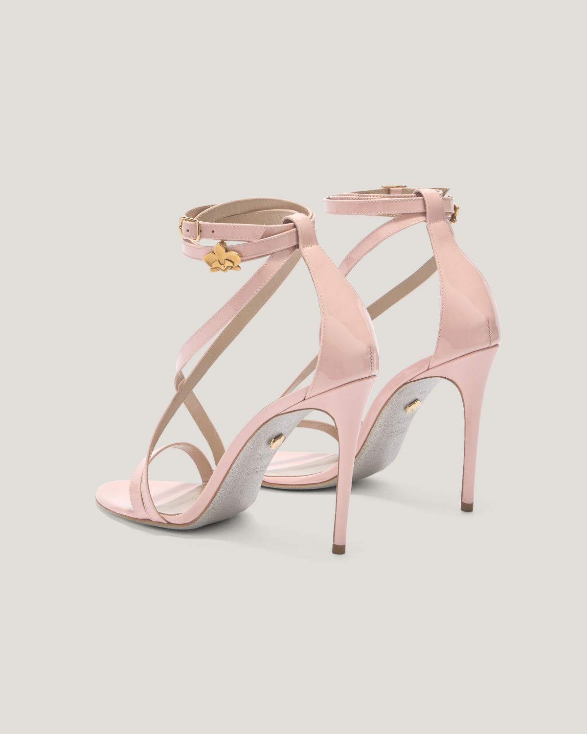 Timeless elegance is embodied in these high-heeled sandals, crafted from high-quality glossy leather. The cross-straps gracefully wrap around the foot, while the double ankle strap adorned with golden details, such as the refined stylized flower, adds a touch of luxury and sophistication. The stiletto heel enhances the silhouette, making these sandals the ideal choice for special evenings or exclusive events. A perfect blend of comfort and style for those seeking a sophisticated look.