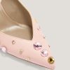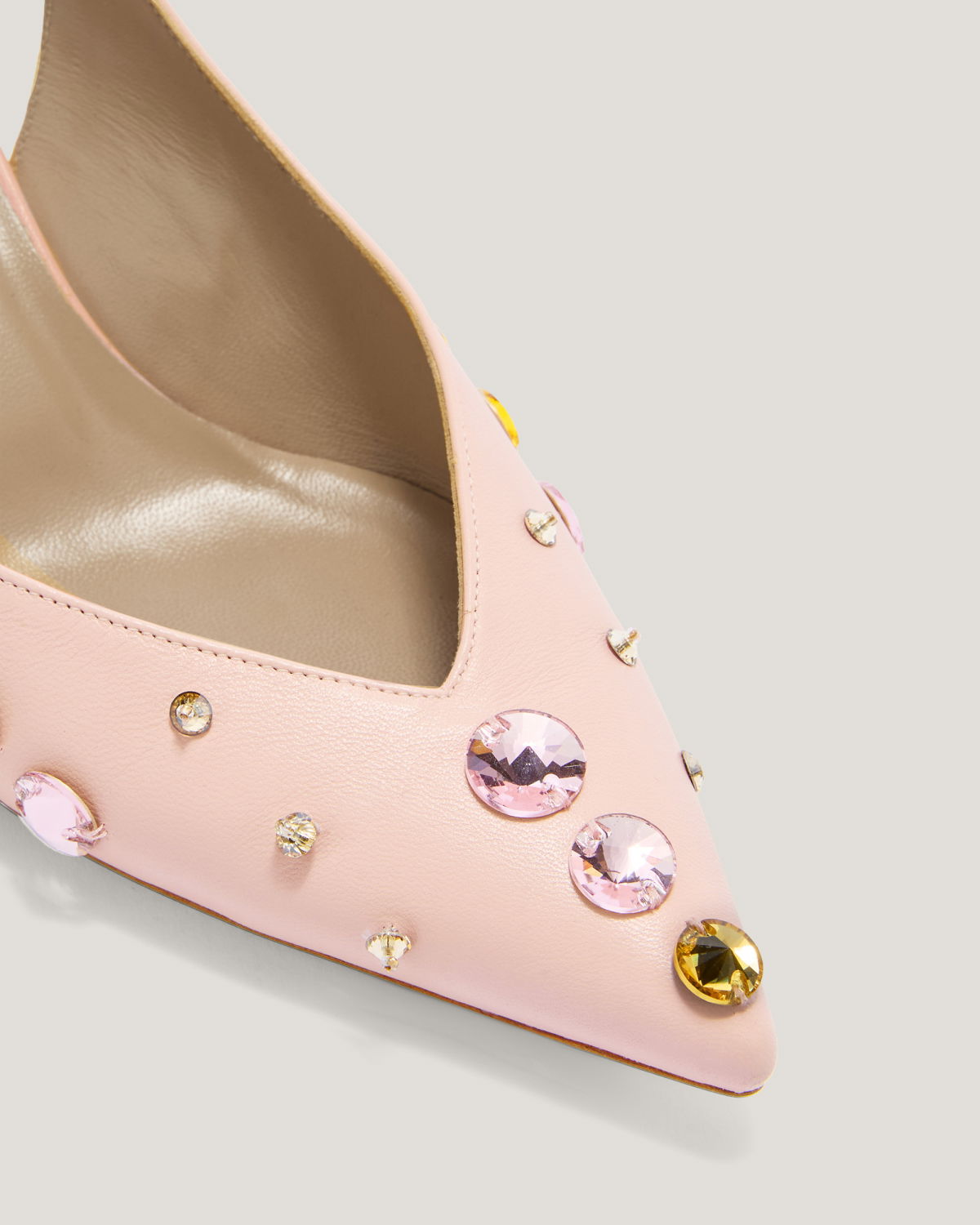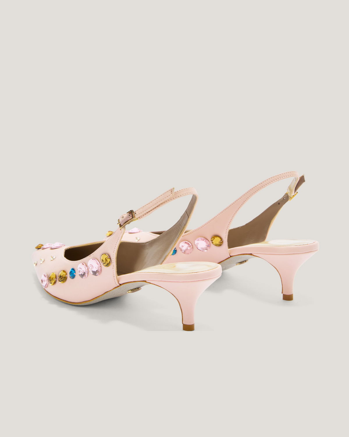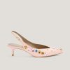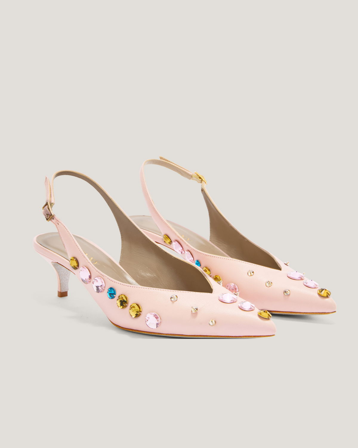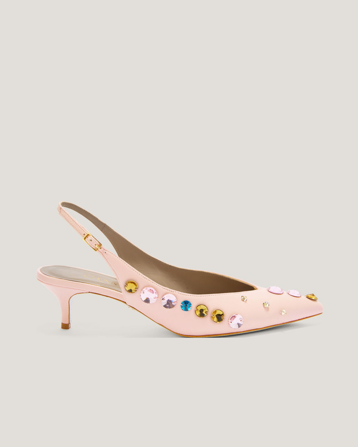 These elegant slingback pumps by Genny, crafted in leather, feature a pointed toe and are embellished with sparkling multicolor crystals. The thin strap with adjustable buckle ensures a secure fit, while the mid heel offers both comfort and style. Perfect for formal occasions or to add a sophisticated touch to casual looks.