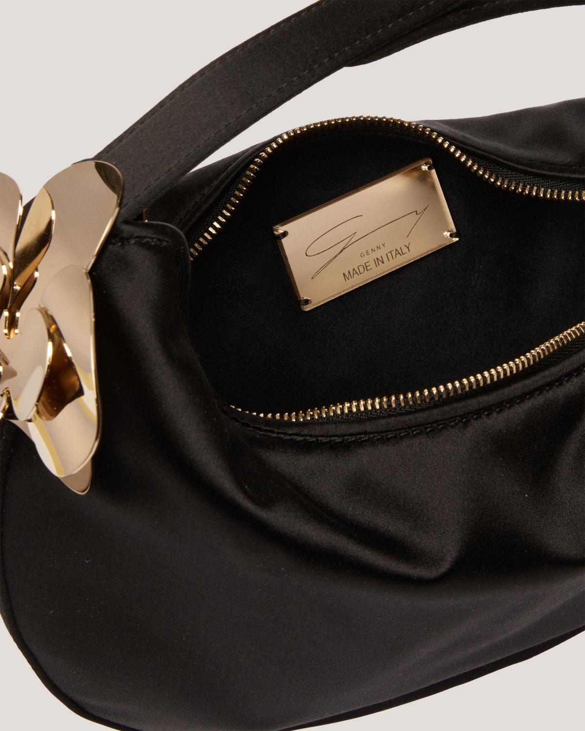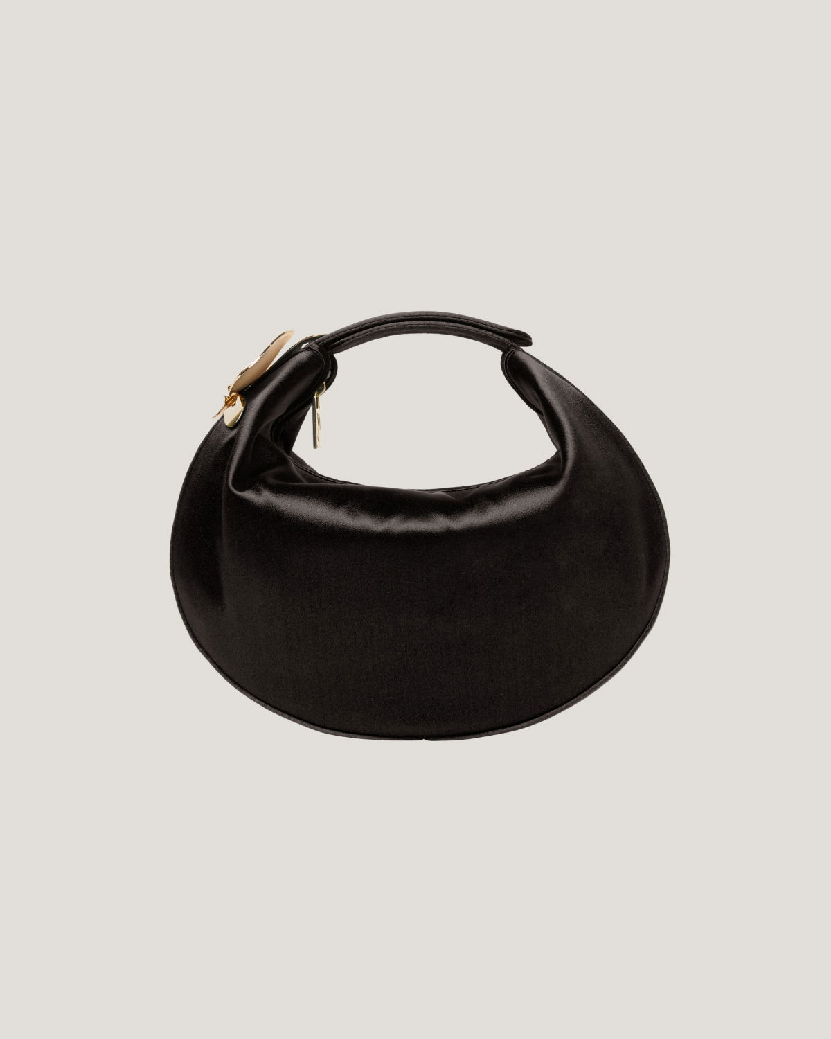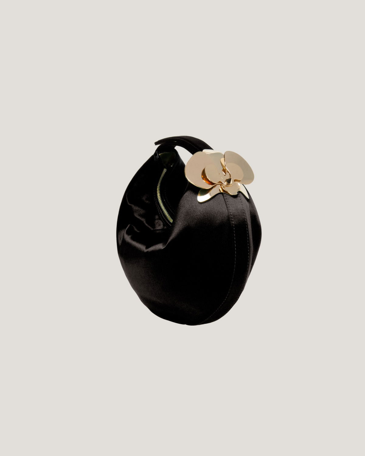 The Fortune bag in satin blends smooth curves with a luminous, refined finish. Its compact silhouette is adorned with a golden metal orchid, an iconic detail of the maison. Equipped with a removable 105 cm satin shoulder strap, it offers styling versatility: carried by hand or worn over the shoulder with effortless grace. Ideal for evening looks and special occasions where brightness makes the difference.