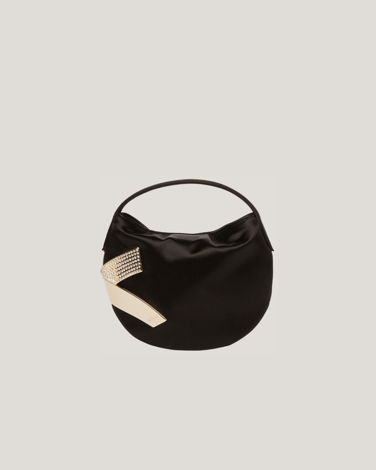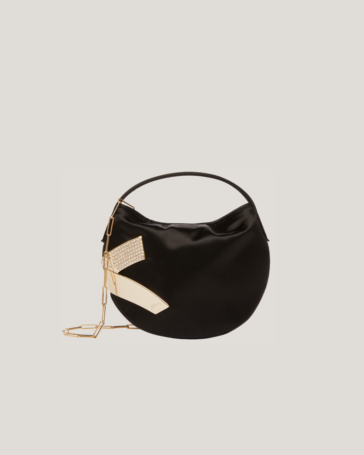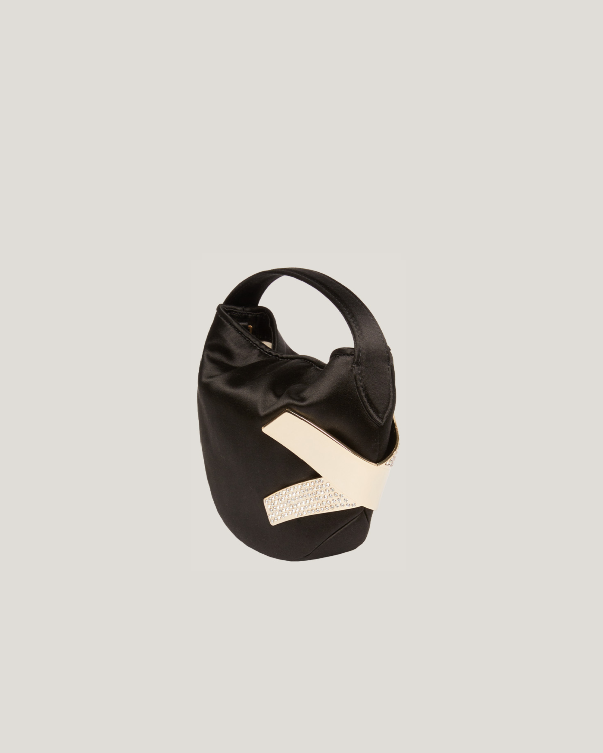 Mini satin bag embellished with a majestic gold and crystal “X” jewel detail, an iconic symbol of the Maison. Featuring a structured handle and a 105 cm satin shoulder strap, it blends practicality and versatility in a perfect balance of elegance and femininity. Ideal to complete both evening looks and refined daytime outfits with grace and radiance.