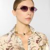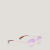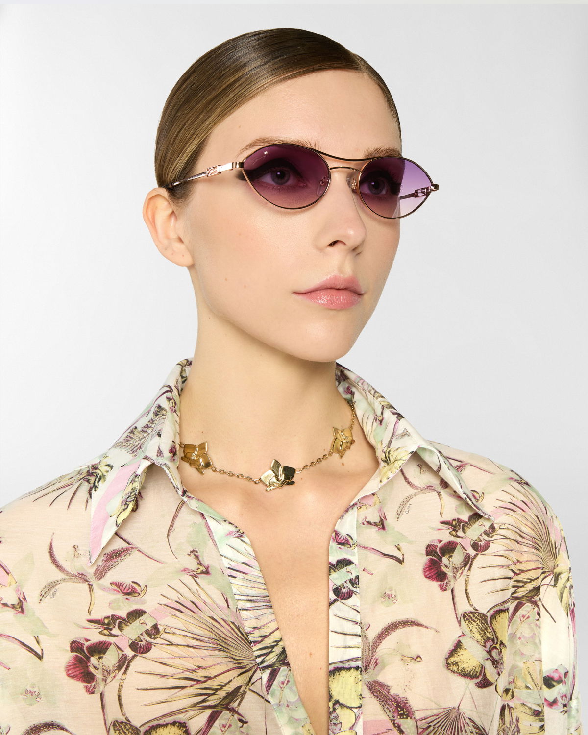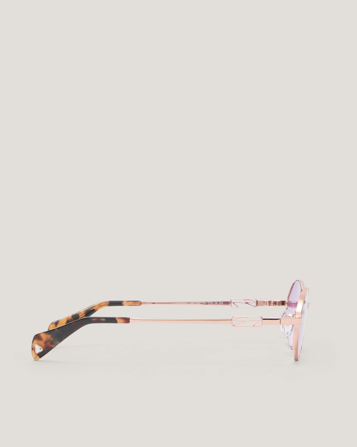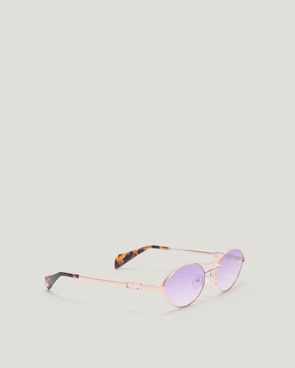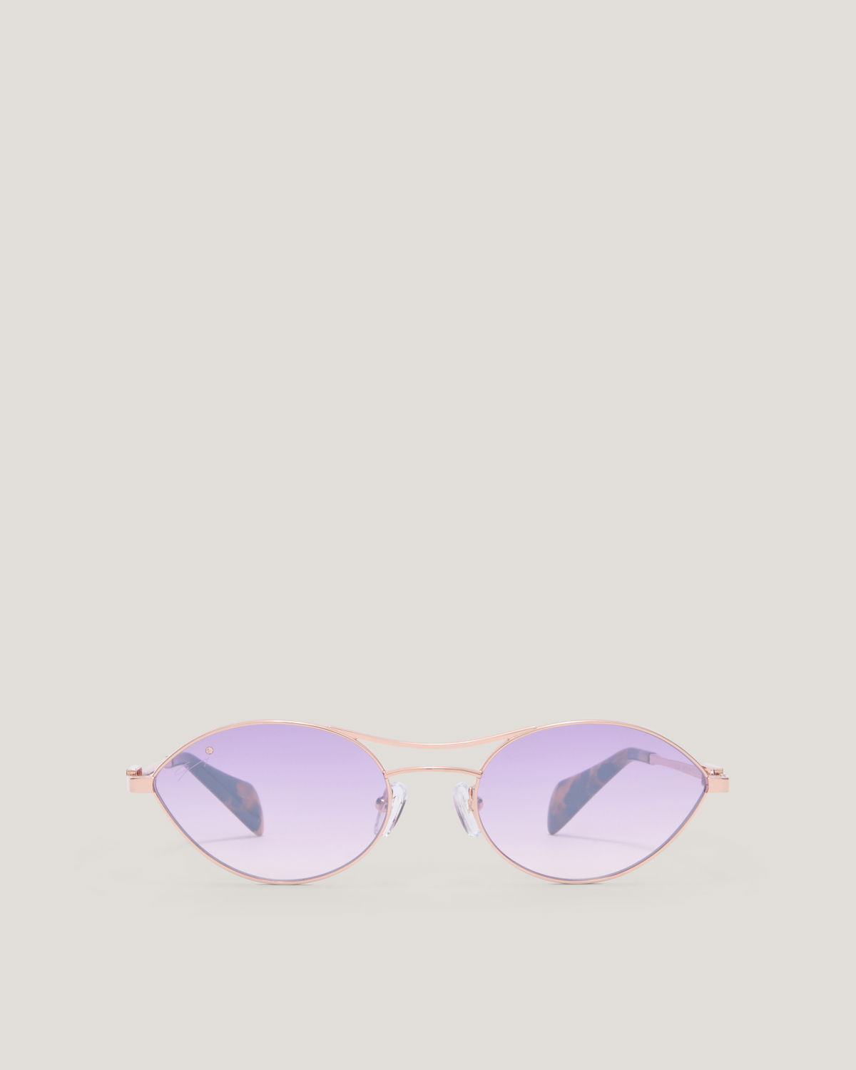 A touch of modern femininity. These oval sunglasses feature a rose gold metal frame and lilac gradient lenses, casting a soft and elegant glow. The tortoiseshell-effect temples introduce a bold, contemporary twist, striking the perfect balance between delicacy and statement style. A luminous piece to elevate any look with refined charm.