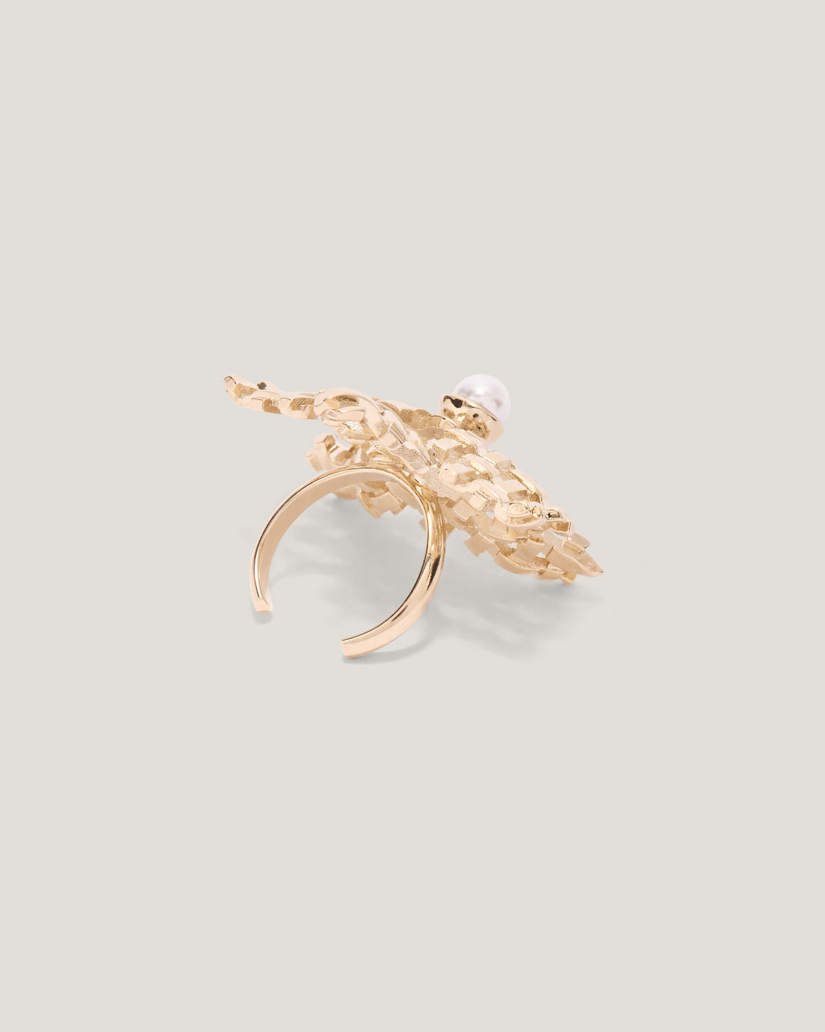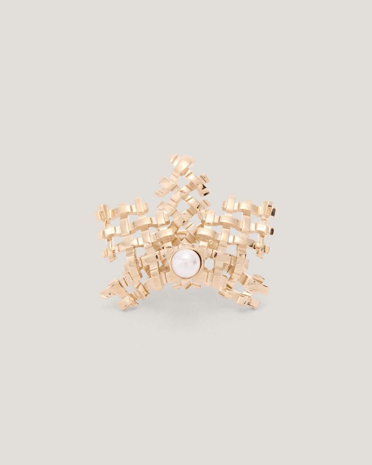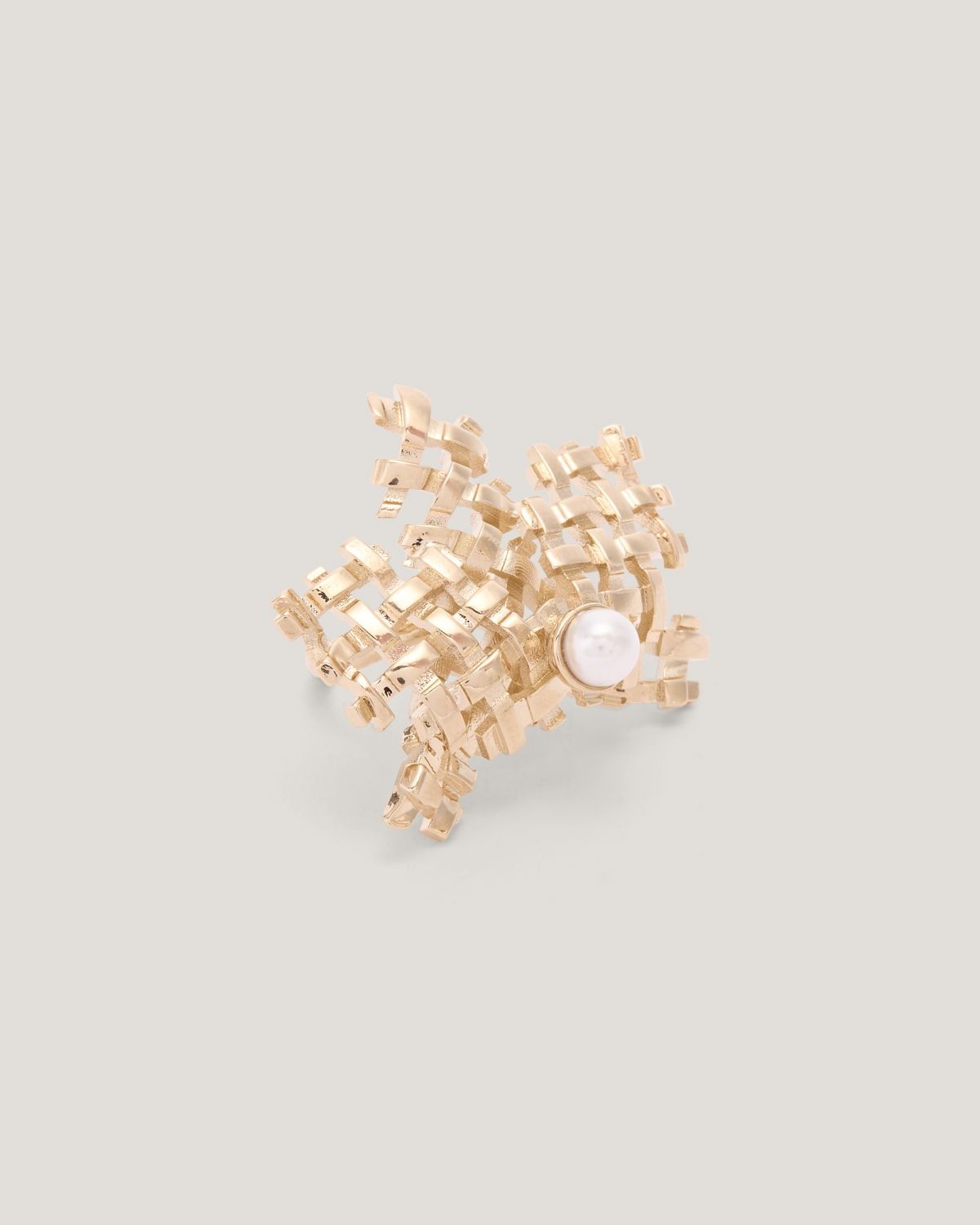 A unique piece that combines craftsmanship and sophisticated style. This Genny ring features an elegant woven gold design, enriched by a central pearl that adds brightness and refinement. Perfect for completing refined looks, adding a distinctive and timeless detail. Its enveloping structure is ideal for those seeking an exclusive accessory to wear on any occasion.