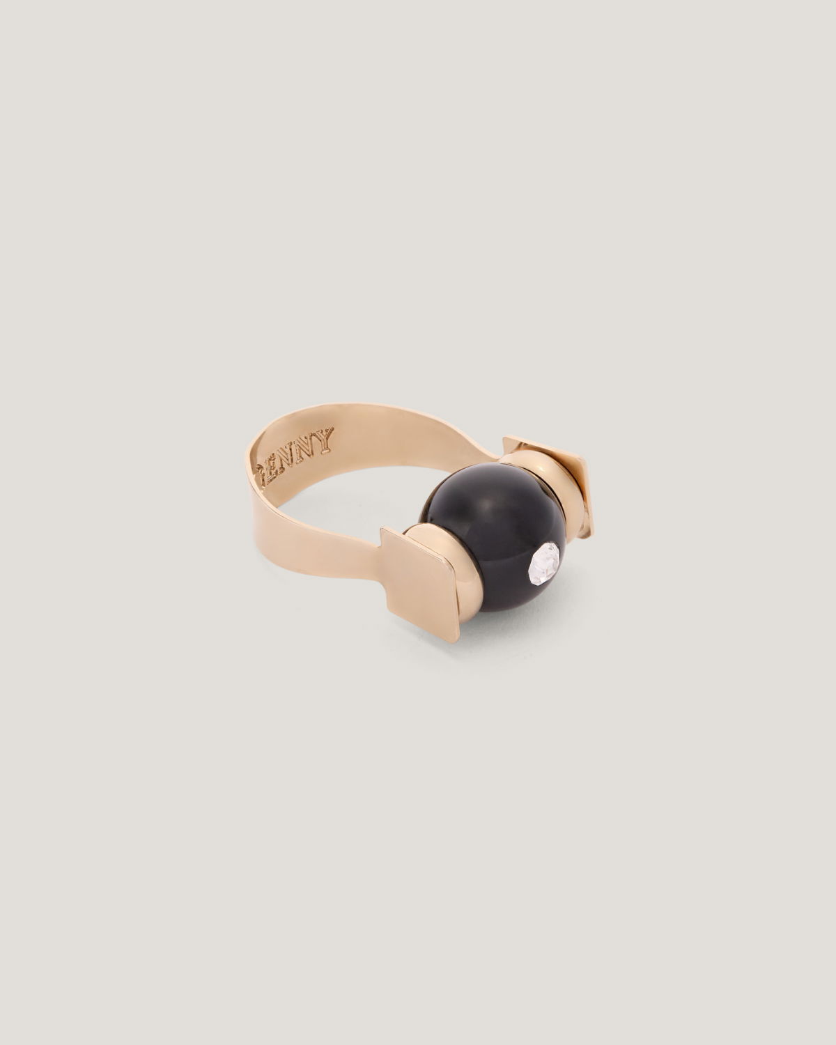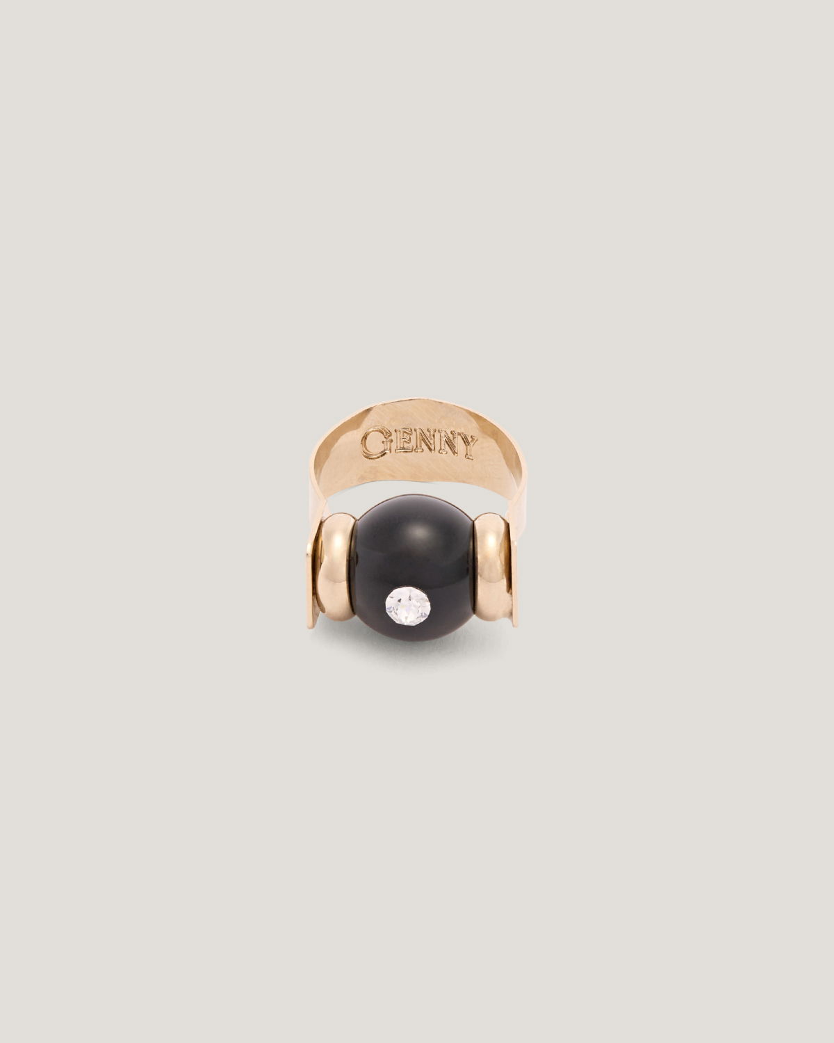 A refined accessory that enhances the elegance of any look. This Genny ring features a polished gold structure, adorned with a central black sphere and a delicate inset crystal, symbolizing timeless femininity and style. The Genny logo is engraved on the inner band, making it a distinctive detail perfect for special occasions or adding a touch of class to your everyday style.